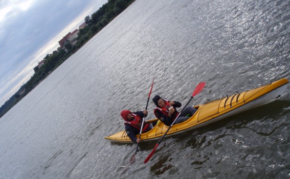 Wiemy, został tylko jeden dzień wyprawy, chcemy pokazać się jeszcze na Zatoce Gdańskiej, dlatego wiosła w dłoń i do przodu. Zatoka okazała się być mocno rozhulana, bujało, że aż strach, uf. My jednak się tak łatwo nie poddajemy dlatego tak jak trzeba zrobiliśmy po zatoce zasłużoną rundkę honorową. Takie małe zaślubiny z morzem. Dalej to juz droga prosta do Sobieszewa.