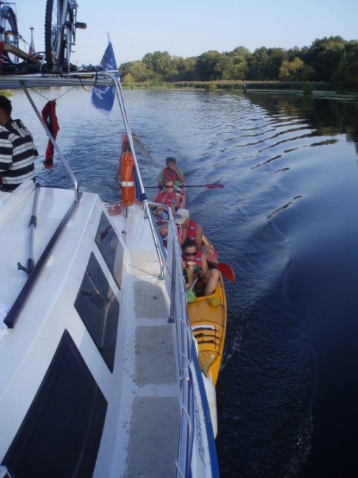 Z Bydgoszczy wypływamy wcześnie, bierzemy na hol kajaki i płyniemy rzeką Brdą do zapory, tu uczestnicy wyprawy przejmują od nas kajaki i w drogę. Po drodze mijamy Fordon. Postój na łasze z telewizją, rozmowy. Do Świecia dopływamy rzeką Wdą. Gratulacje za bardzo wygodny pomost cumowniczy. Zwiedzamy Zamek, strasznie w nim straszy! Wieczorem pogaduszki przy ognisku.