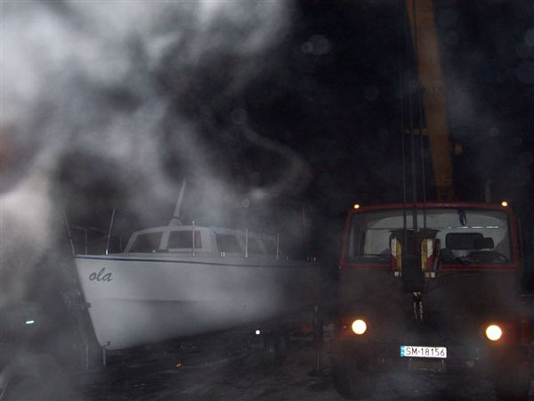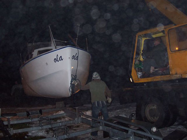Dziś wieczorem Ola przyjechała na lawecie do Jaworzna. Rozładunek dźwigiem i już stoi na białym puchu na zapleczu naszej firmy... Z pewnością to koniec podróży na ten sezon! Powrót na wodę planujemy na początek kwietnia przyszłego roku...